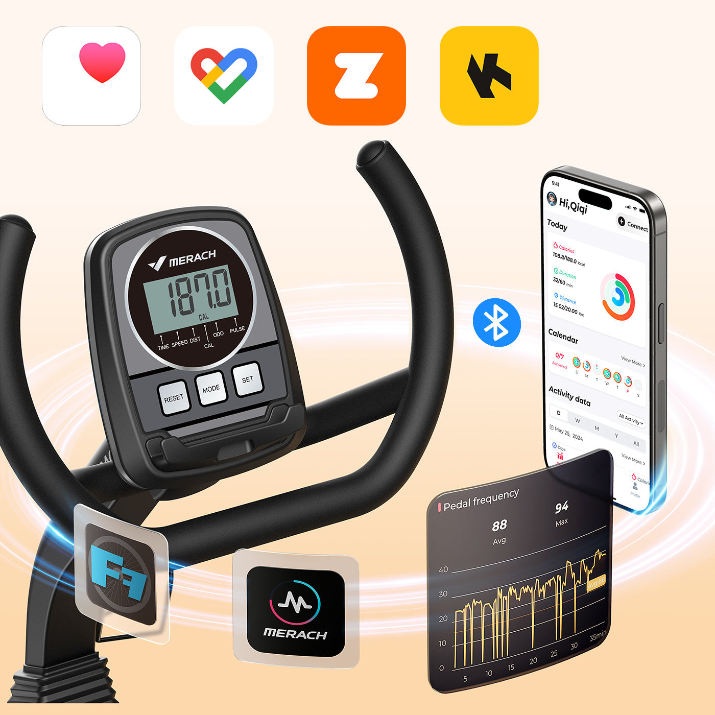 Developed by professional fitness trainers, the app offers a variety of courses and training modes to help you achieve your fitness goals. (Compatible apps: Merach, Kinomap, Zwift, Apple Health, Google Fit, Fanton Fite by Merach).
